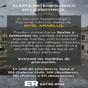 El Servicio Meteorológico Nacional emitió un alerta amarilla por lluvias y tormentas -ocasionalmente fuertes-, que rige desde la tarde de este viernes hasta horas de la mañana del sábado, para los departamentos Concordia, Federación, Federal, Feliciano, San Salvador, Colón, Concepción del Uruguay, Rosario del Tala, Gualeguay, Victoria, Gualeguaychu e Islas del Ibicuy.