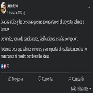 Juan Erro, en diálogo con Orilla y Media TV en el mes de mayo adelantaba “hay una situación en la provincia que no ha sido propicia, en un primer momento quisimos integrarnos en el armado, lamentablemente las pautas que acordamos no se cumplían, había principios y valores muy ajeno de los que nosotros buscamos en una incursión política. Cuando vimos que esas condiciones no se cumplían, decidimos dar un paso al costado y guardar nuestro espacio para más adelante”. Los últimos días, lo publicado en sus redes sociales mostraban la disconformidad de este joven dirigente libertario gualeyo, sobre cómo se había resuelto el armado de las listas de Javier Milei en la provincia de Entre Ríos.