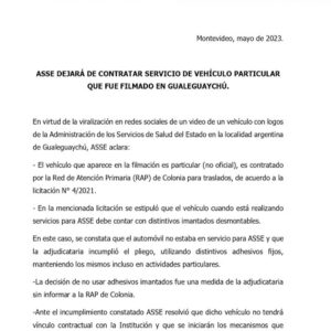 Mediante comunicado la Administración de Servicios de Salud del Estado (ASSE), tras trascender un video donde una persona con su taxi de Nueva Palmira estaba en Gualeguaychú, no al servicio de ASSE pero con los adhesivos del organismo estatal, provoca que caiga la contratación